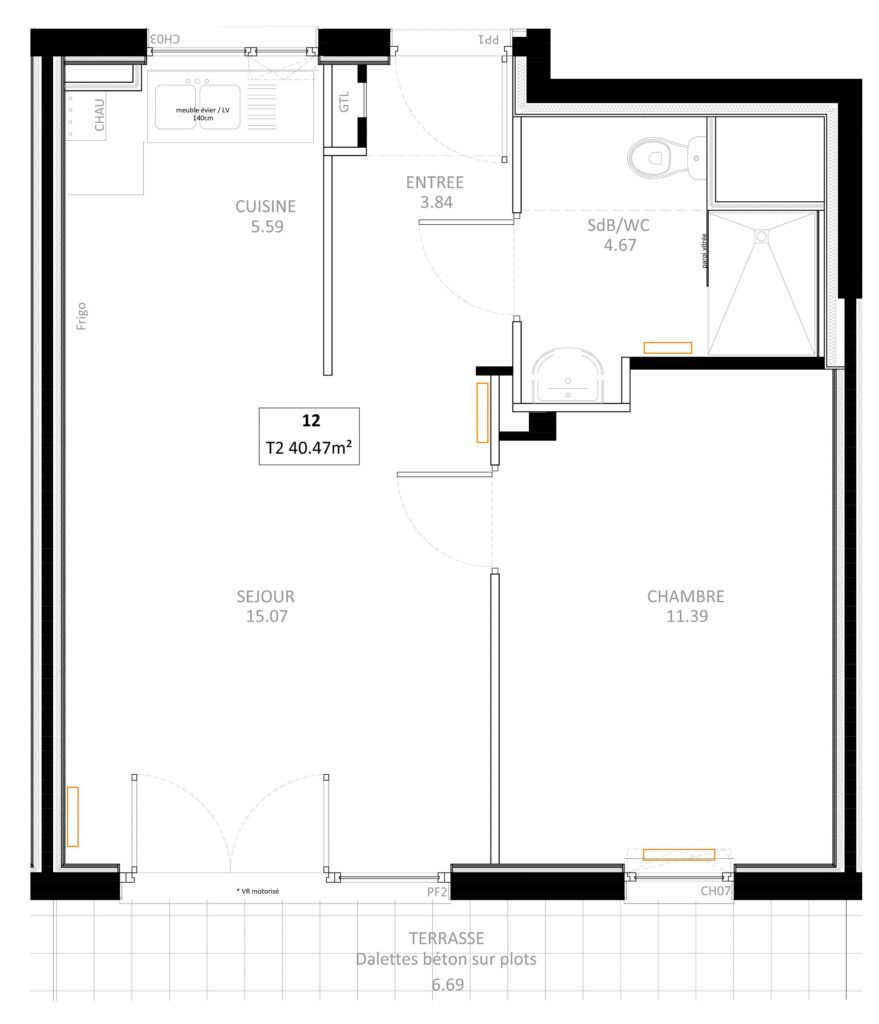 Il s’agit d’un T2 de 40,47 m² situé au 3e étage. Il comprend une entrée, un séjour cuisine traversant, une chambre, une salle de bain avec wc et un balcon (voir plan). Aucune place de stationnement n’est disponible. Ce logement est destiné à un couple ou une personne seule.